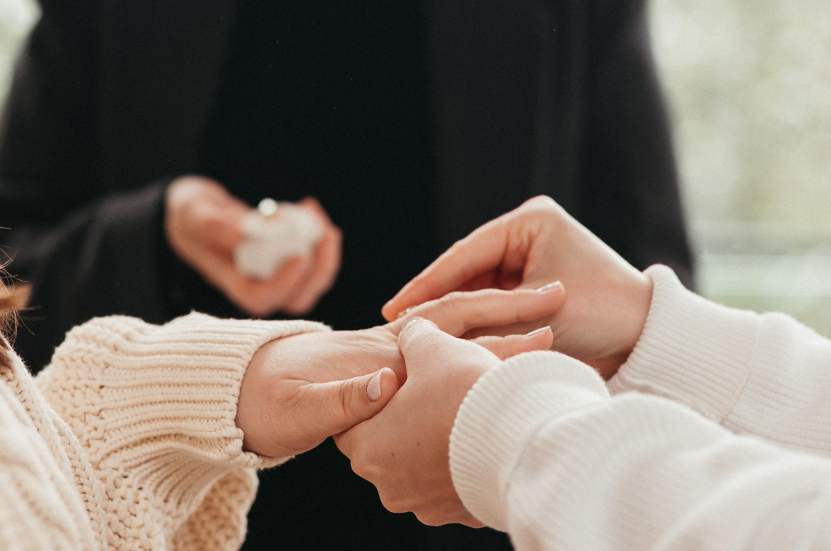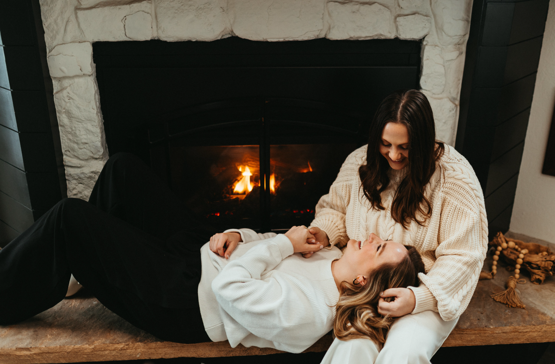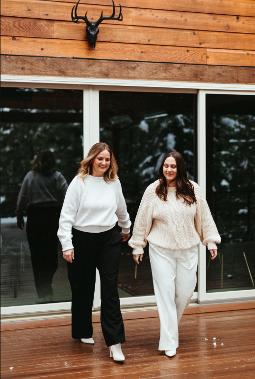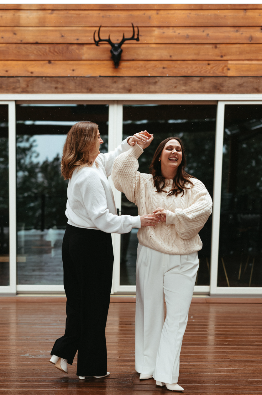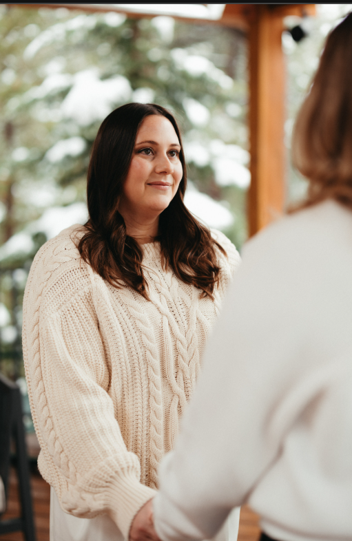 The ceremony unfolded on the deck in softly falling snow. Molly and Sarah wore white sweaters, a simple and meaningful choice. With no guests present, every moment felt private and deeply personal.