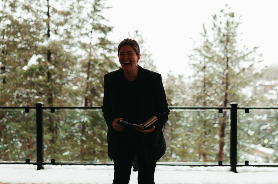 The couple stayed at Juniper for three nights, turning their wedding into a long, unhurried weekend. Their ceremony took place on April 27, right on the Mountain View Deck, as snow dusted the surrounding pines and softened the mountain views.