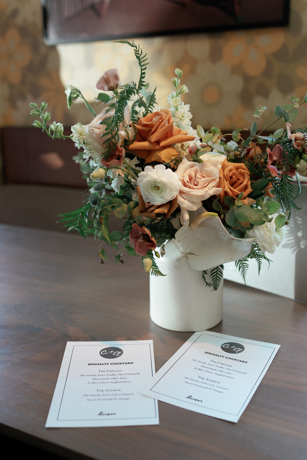 Chelsea and Andrew arrived at Juniper together in the early afternoon with their photographer, Steph Hennessey, already documenting the day. They arrived dressed and ready, giving themselves time to settle in before the ceremony. They shared a private first look shortly after arriving. With a Negroni for Andrew and a gin and tonic with lime for Chelsea, the moment felt calm and celebratory. Their dogs, Pippen and Shortcake, stayed close by with the best men, adding a personal detail that reflected who they are as a couple.