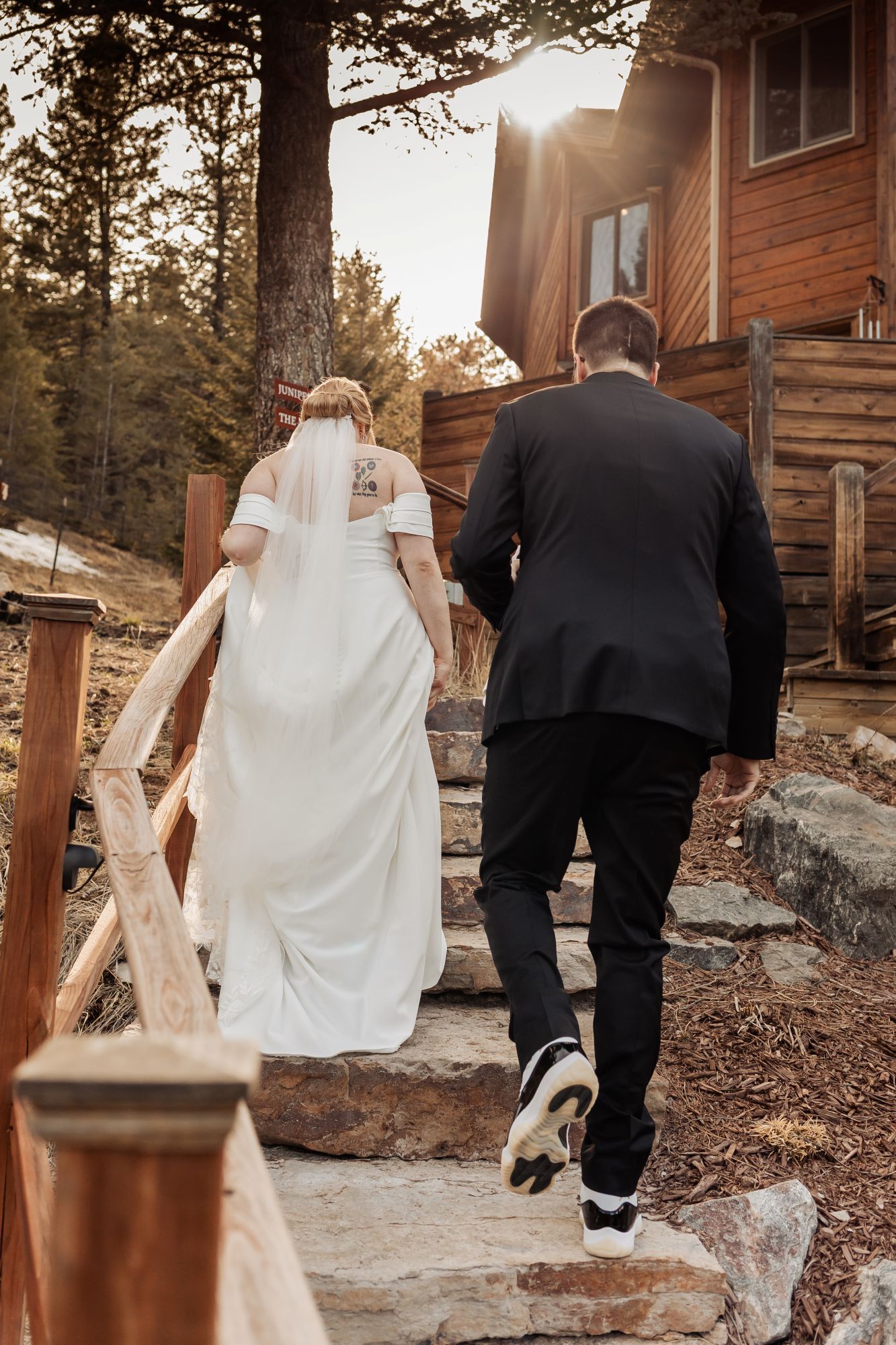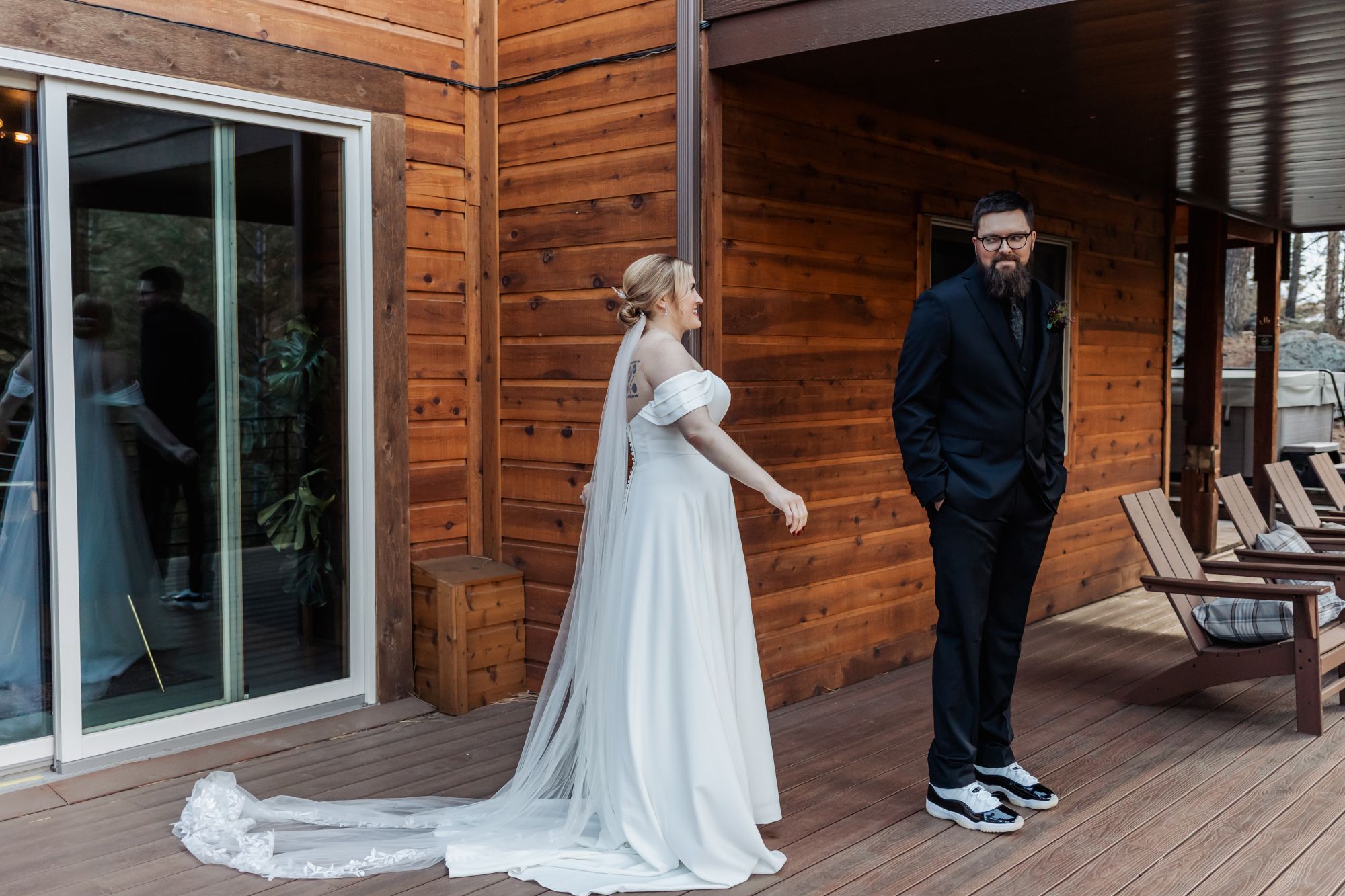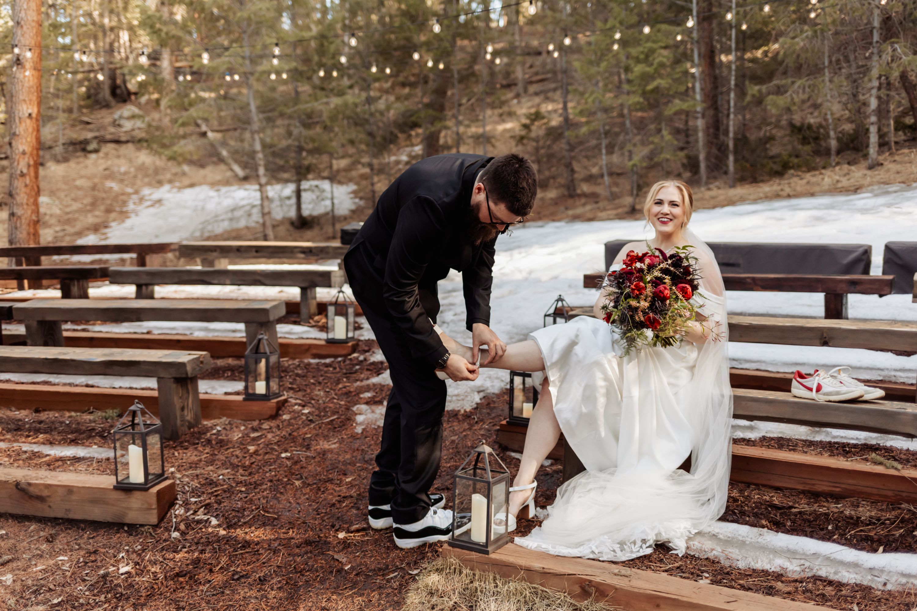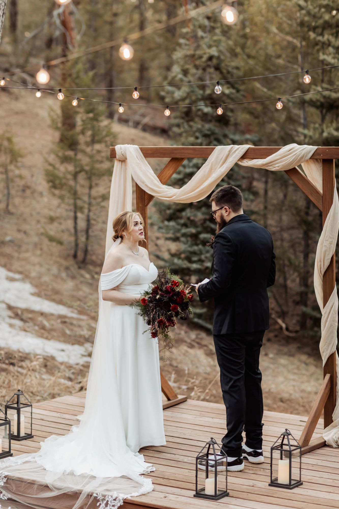 Once ready, Amelia and AJ stepped onto the deck for their first look. The mountains were quiet under a light dusting of snow, and the scene held that calm, early-spring glow. Before heading to the meadow, they took photos with Mom and then AJ helped Amelia change into her sneakers for the walk down the path. When they reached the ceremony site, he helped her slip back into her heels — a small gesture that perfectly captured the tenderness of their day.