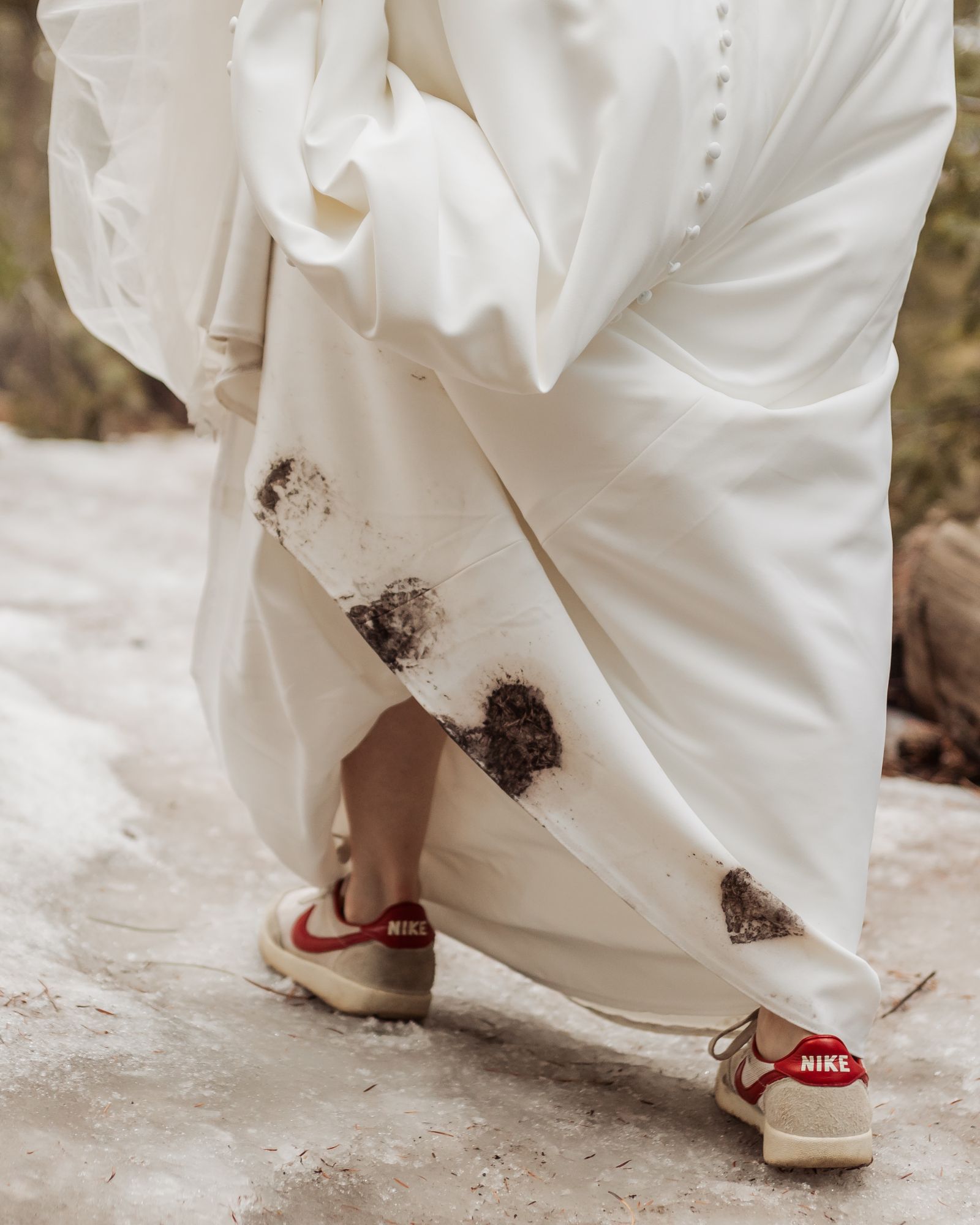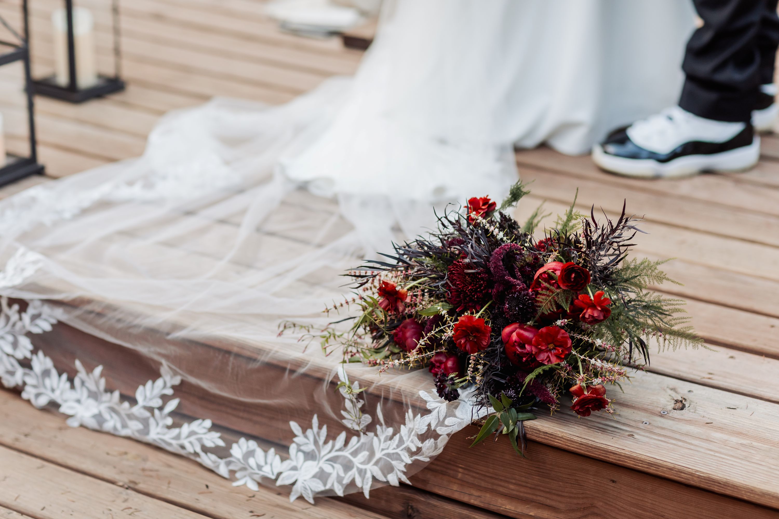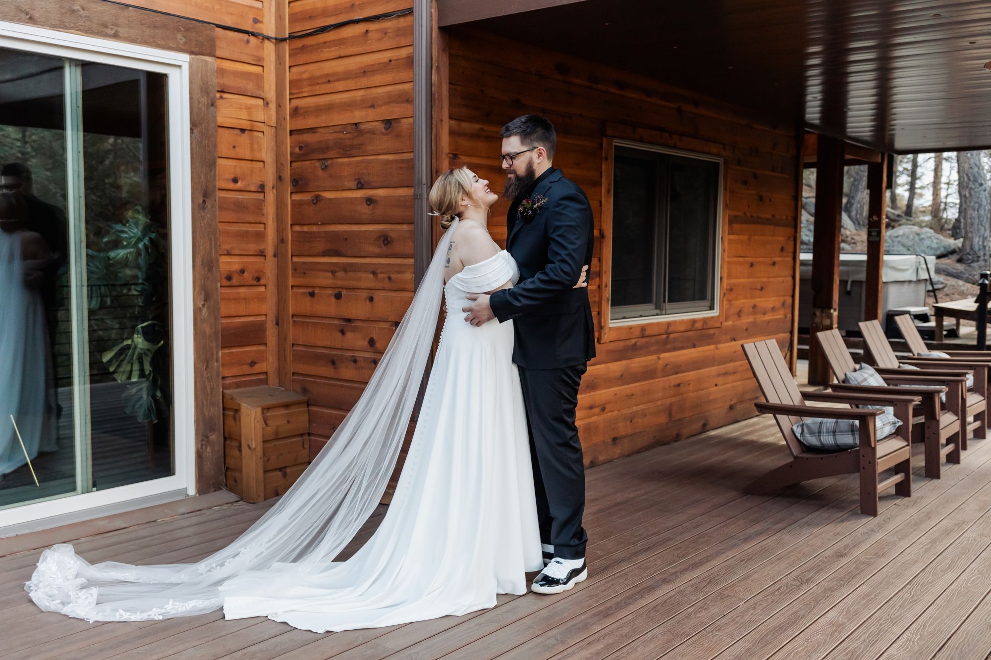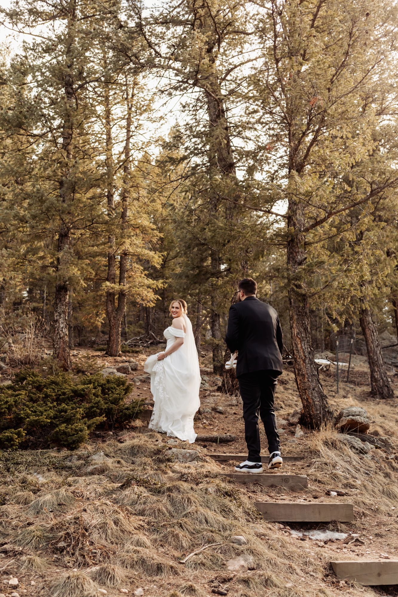 Once ready, Amelia and AJ stepped onto the deck for their first look. The mountains were quiet under a light dusting of snow, and the scene held that calm, early-spring glow. Before heading to the meadow, they took photos with Mom and then AJ helped Amelia change into her sneakers for the walk down the path. When they reached the ceremony site, he helped her slip back into her heels — a small gesture that perfectly captured the tenderness of their day.