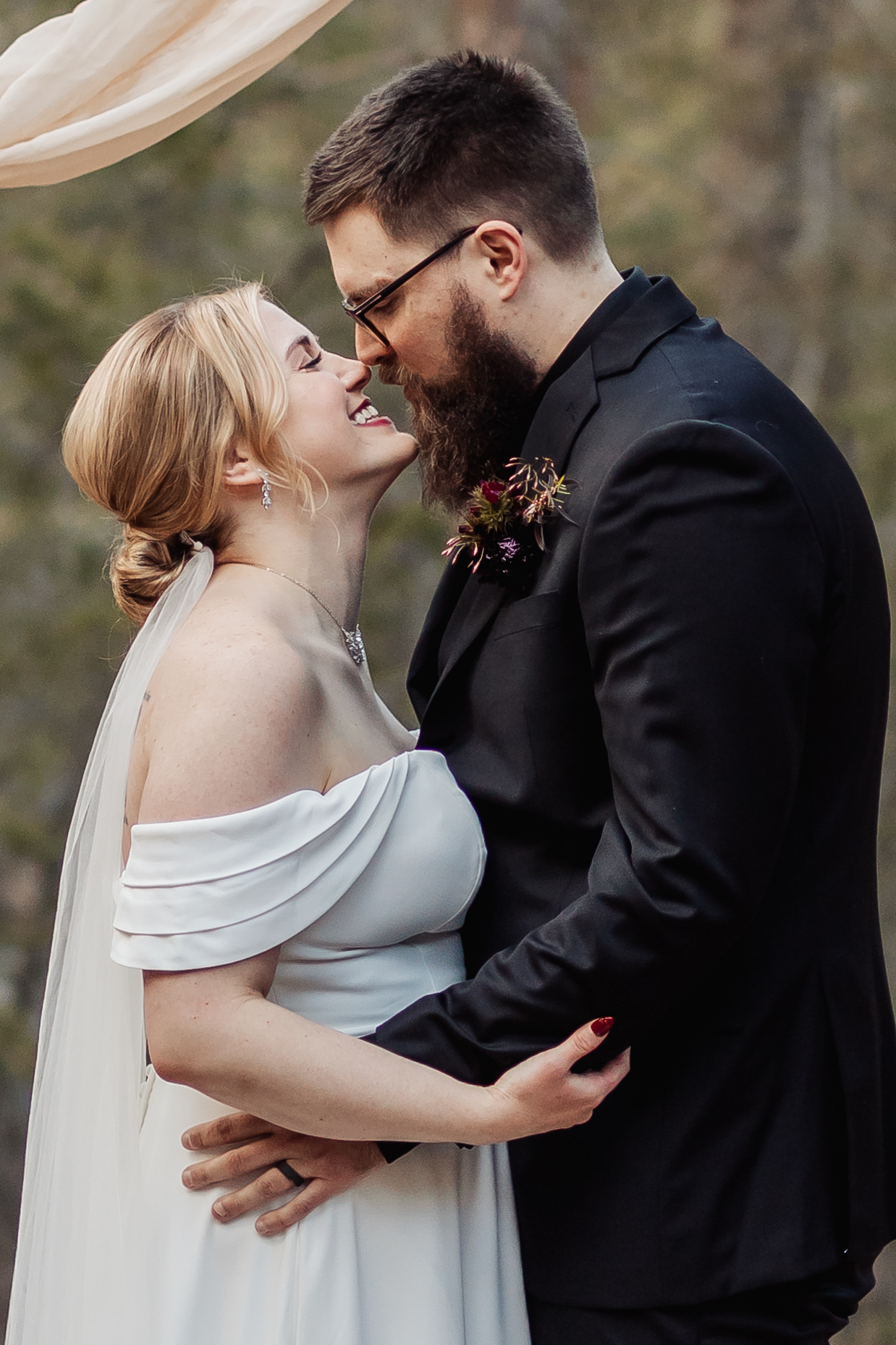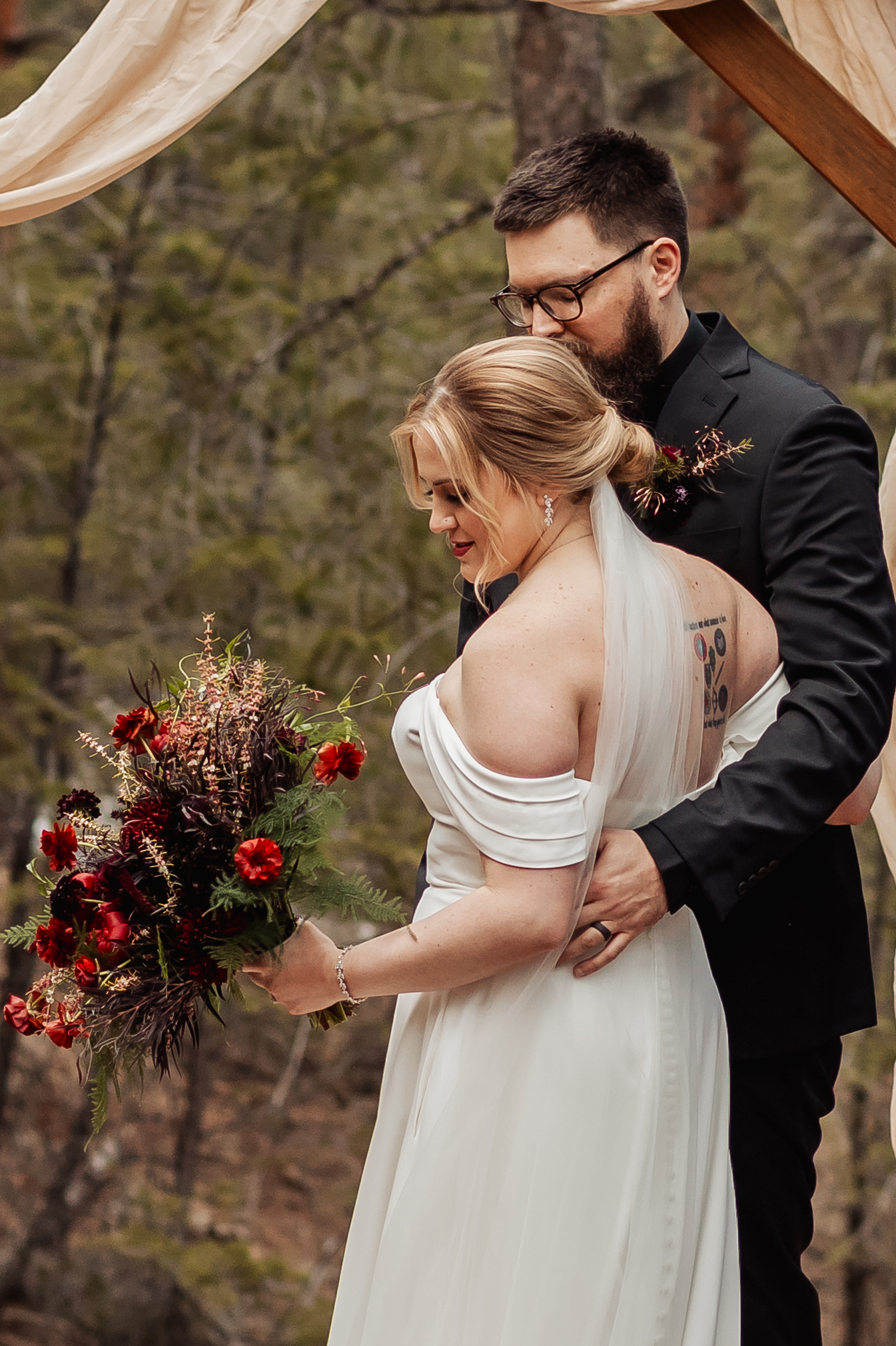They stood together in the meadow, surrounded by pines, snow patches, and open sky, and read their vows with no one else around. It was quiet and unhurried — exactly the kind of moment they wanted for their Colorado elopement. Afterward, they moved through portraits at their own pace, taking in the crisp air and soft spring light.