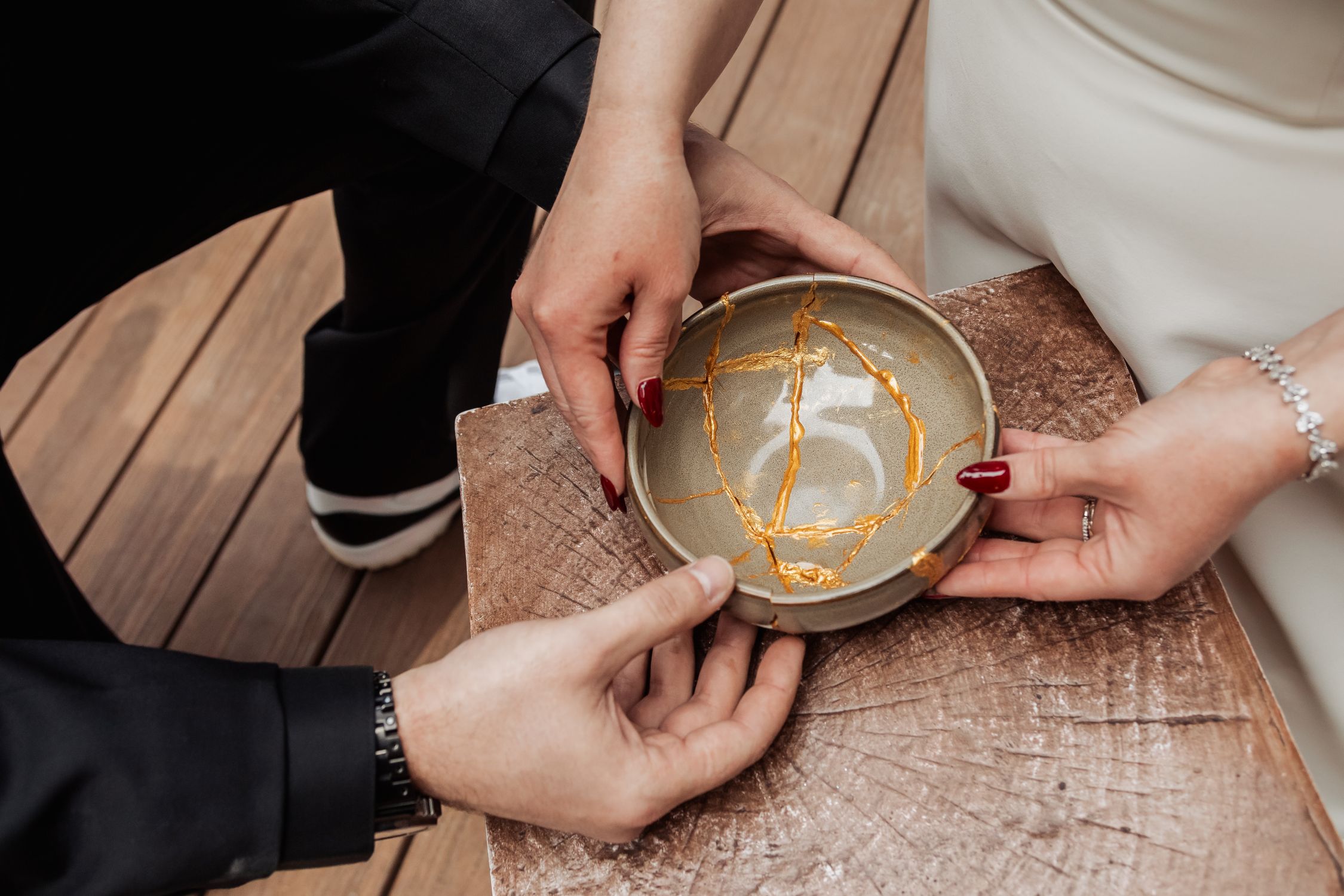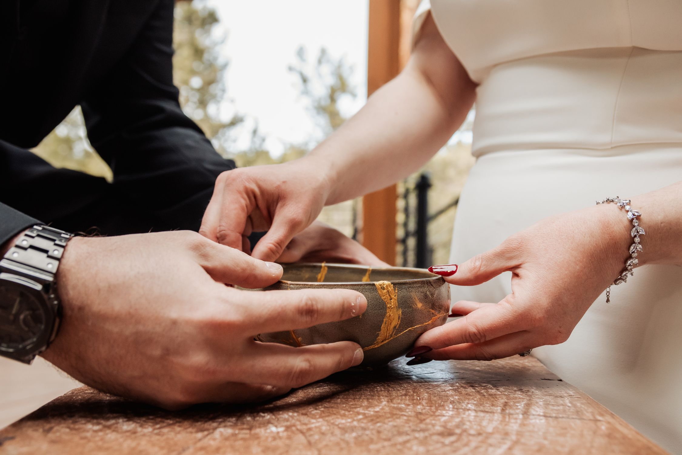 Back at the lodge, they continued their celebration with a meaningful tradition: repairing a broken bowl with gold. Inspired by the Japanese art of kintsugi, it reflects the belief that broken things can be mended into something even stronger and more beautiful. It was a thoughtful way to honor the resilience and care they plan to bring into their marriage.