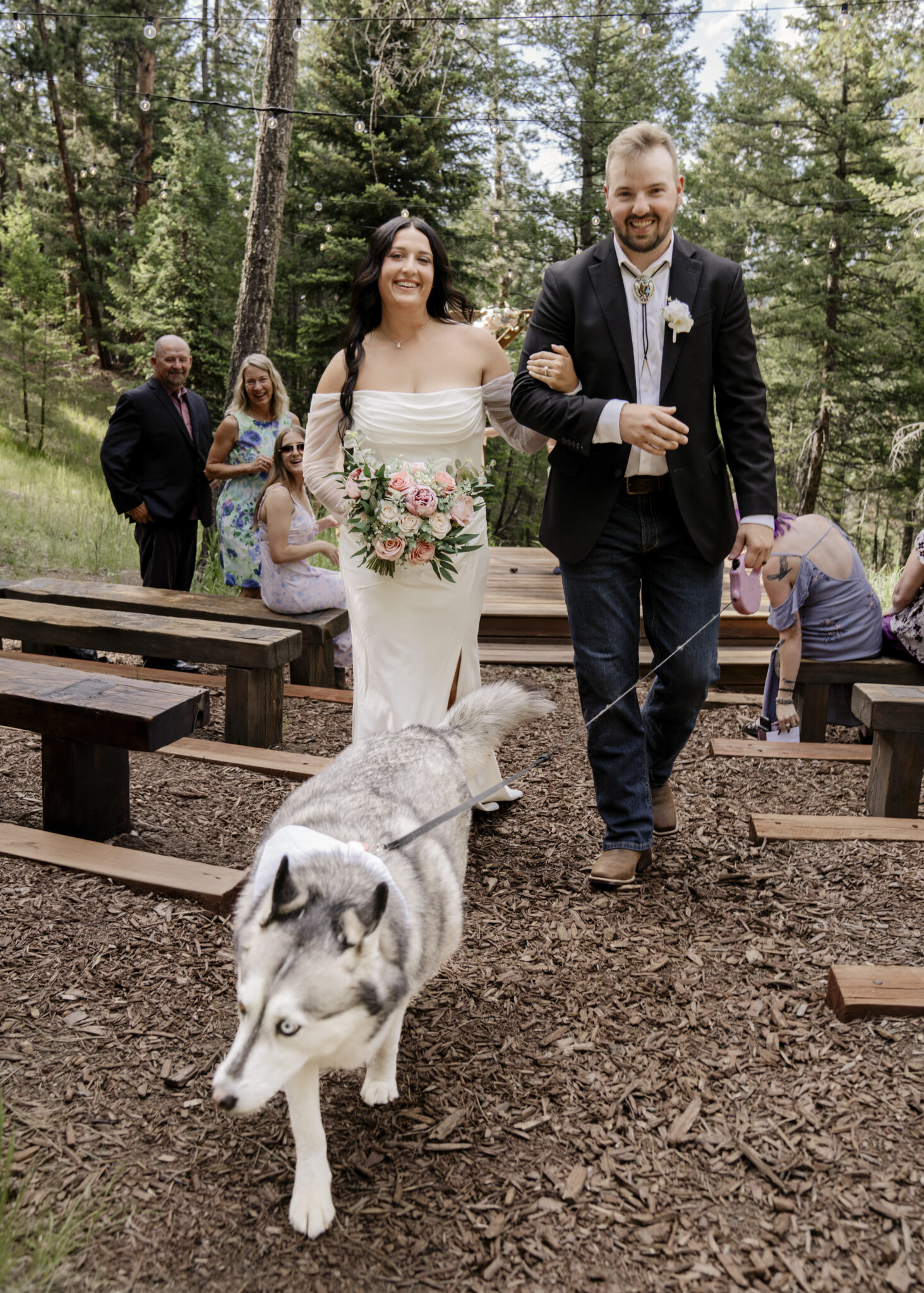 Cody walked with his mom, followed by Sam and her dad, each step slow and steady. When Sam’s mom, Ann, began to speak, everyone stilled. Their dog, Nikita, trotted up right on cue with the rings — the kind of unscripted moment that makes small weddings feel alive.