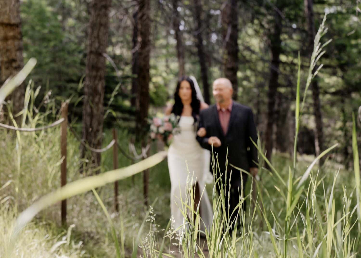 Guests made their way down the wooded path to Juniper Lodge & Treehouses, one of Evergreen’s most scenic wedding venues. The meadow was quiet except for the soft sound of Tyler Childers drifting through the speakers and the wind moving through the trees.