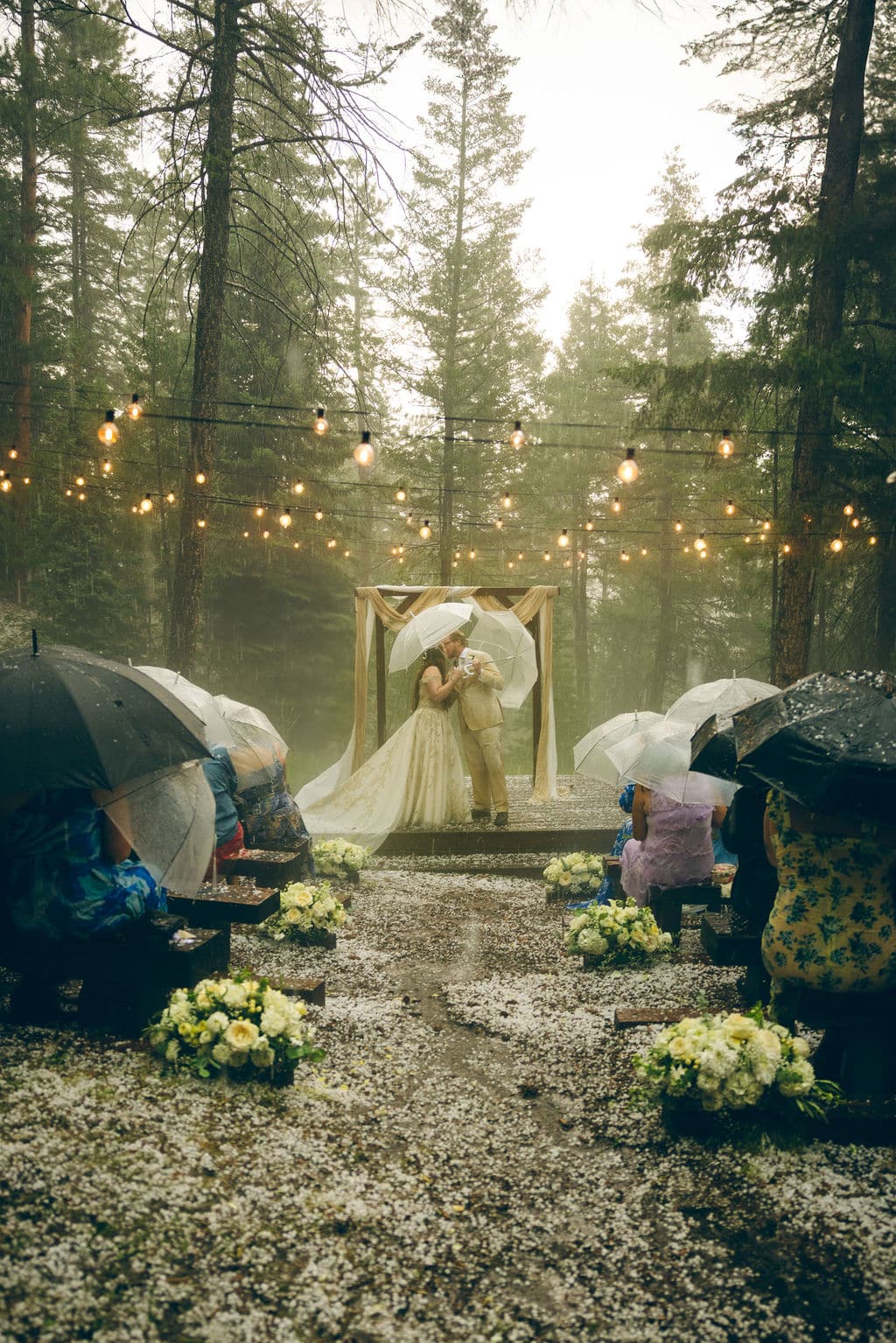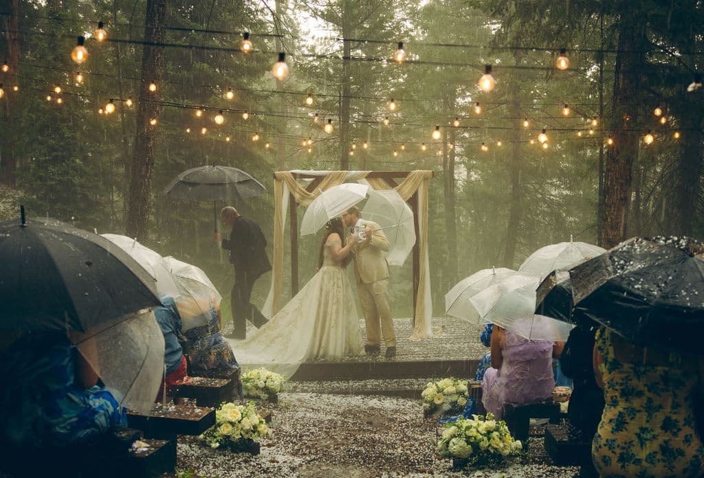 Halfway through their vows, the weather unexpectedly turned—sunshine to hail in true Colorado fashion—but no one moved. Umbrellas popped open, laughter broke out, and the couple just smiled through it all. It was authentic, unforgettable, and perfectly them.