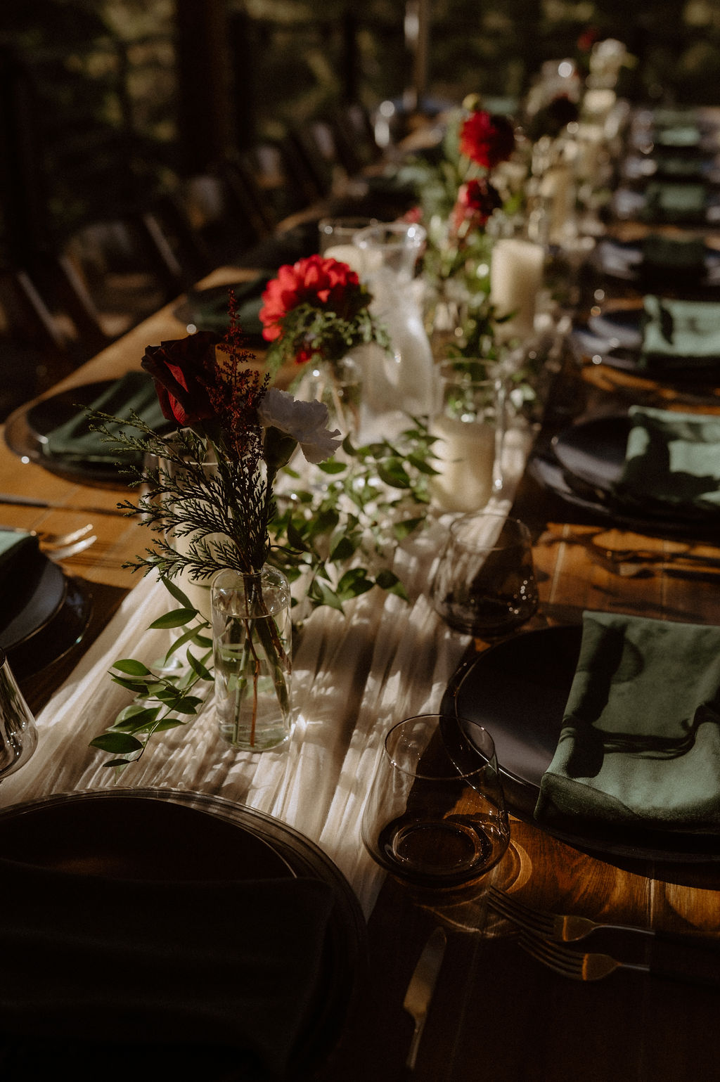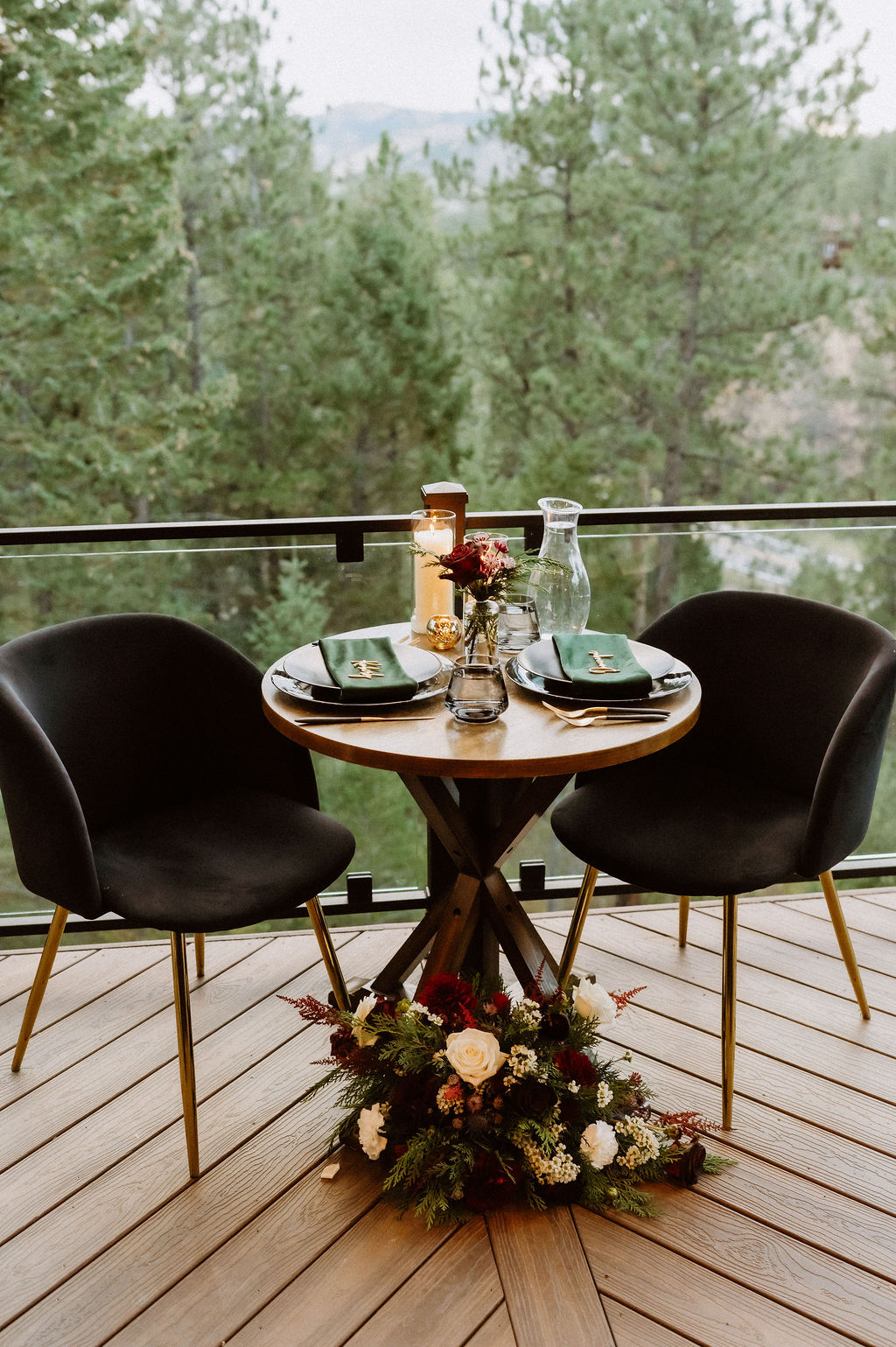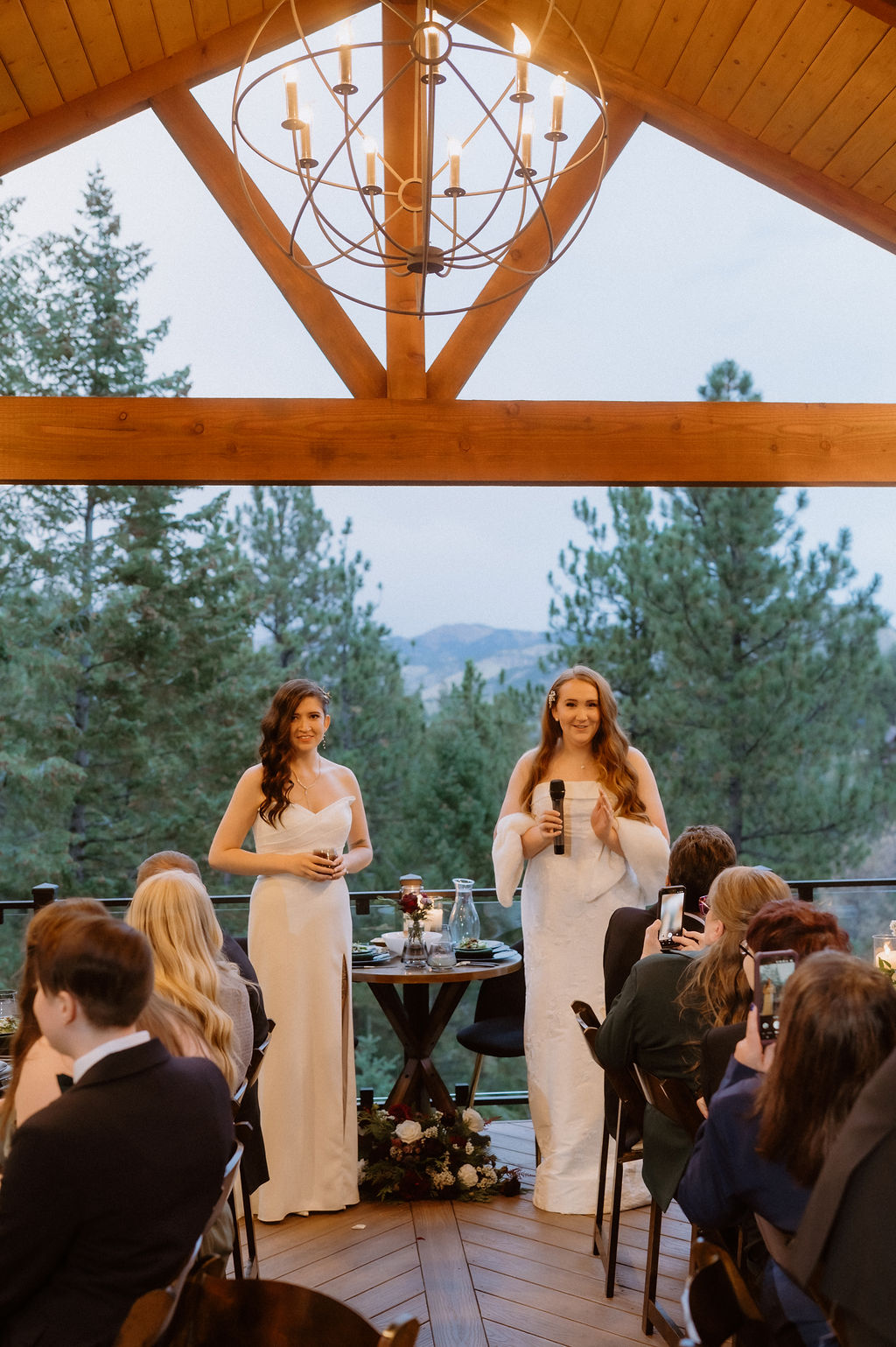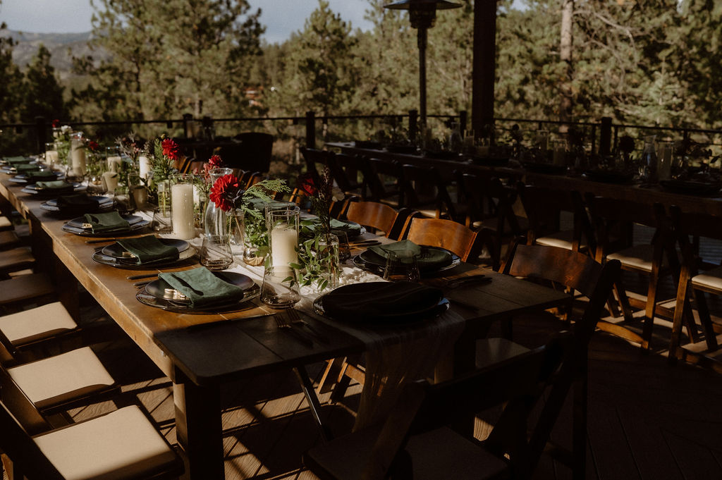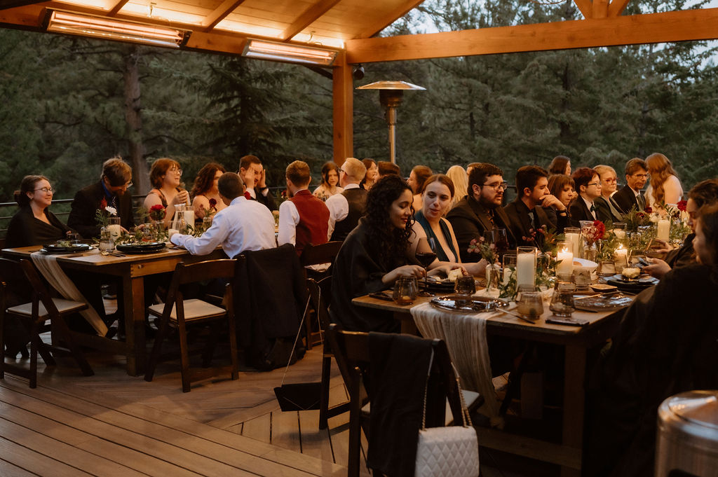 After the ceremony, guests gathered on the deck for cocktails while Kim and Domi stepped away briefly for portraits. When they rejoined everyone, the energy shifted naturally into celebration — relaxed conversation, shared laughter, and mountain views stretching outward.