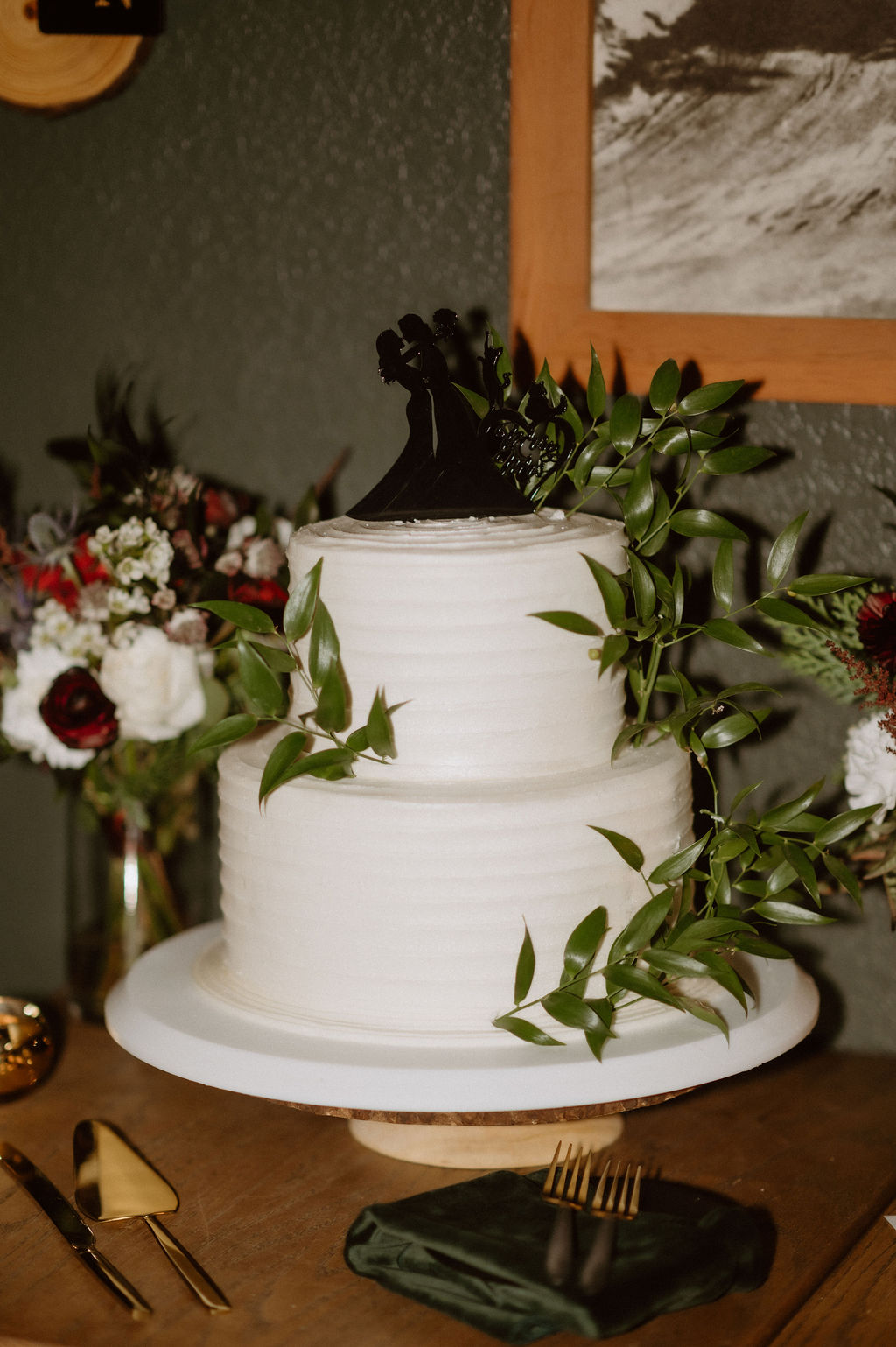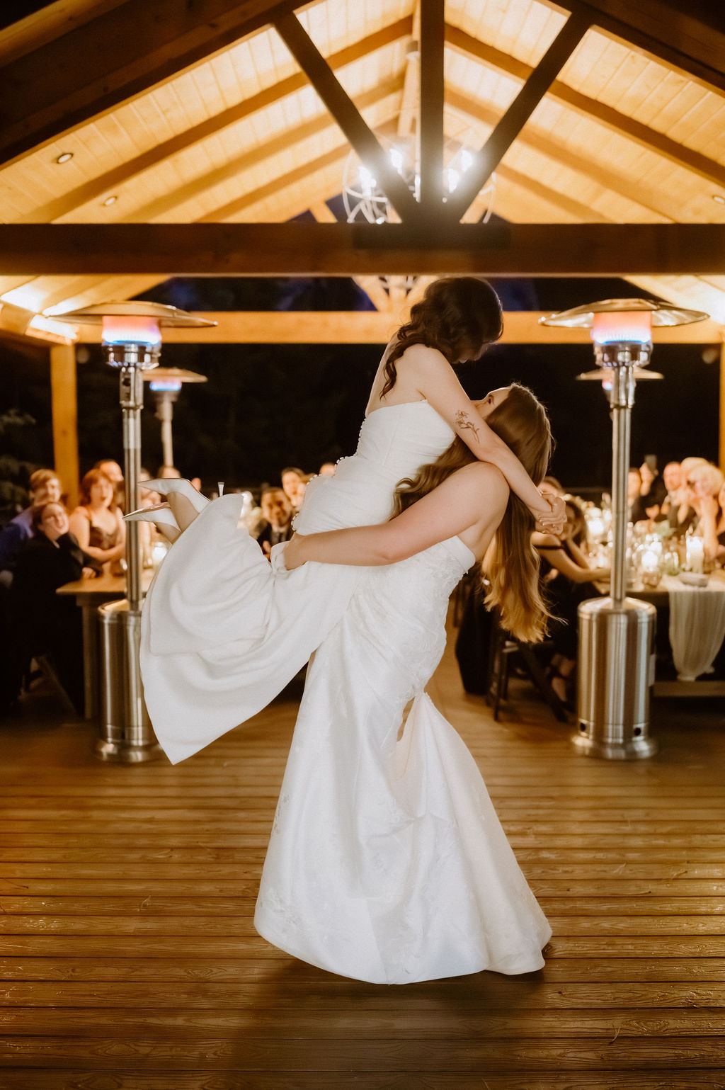 Dinner on the deck unfolded exactly as they’d hoped. Heaters glowed as Deshebrado Catering served a plated meal, allowing everyone to slow down and settle into the evening. Speeches followed, filled with gratitude and stories that reflected Kim and Domi’s relationship. Cake from Das Meyer Fine Pastry Chalet marked the transition into the night ahead.