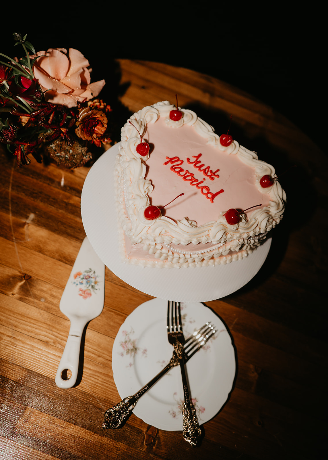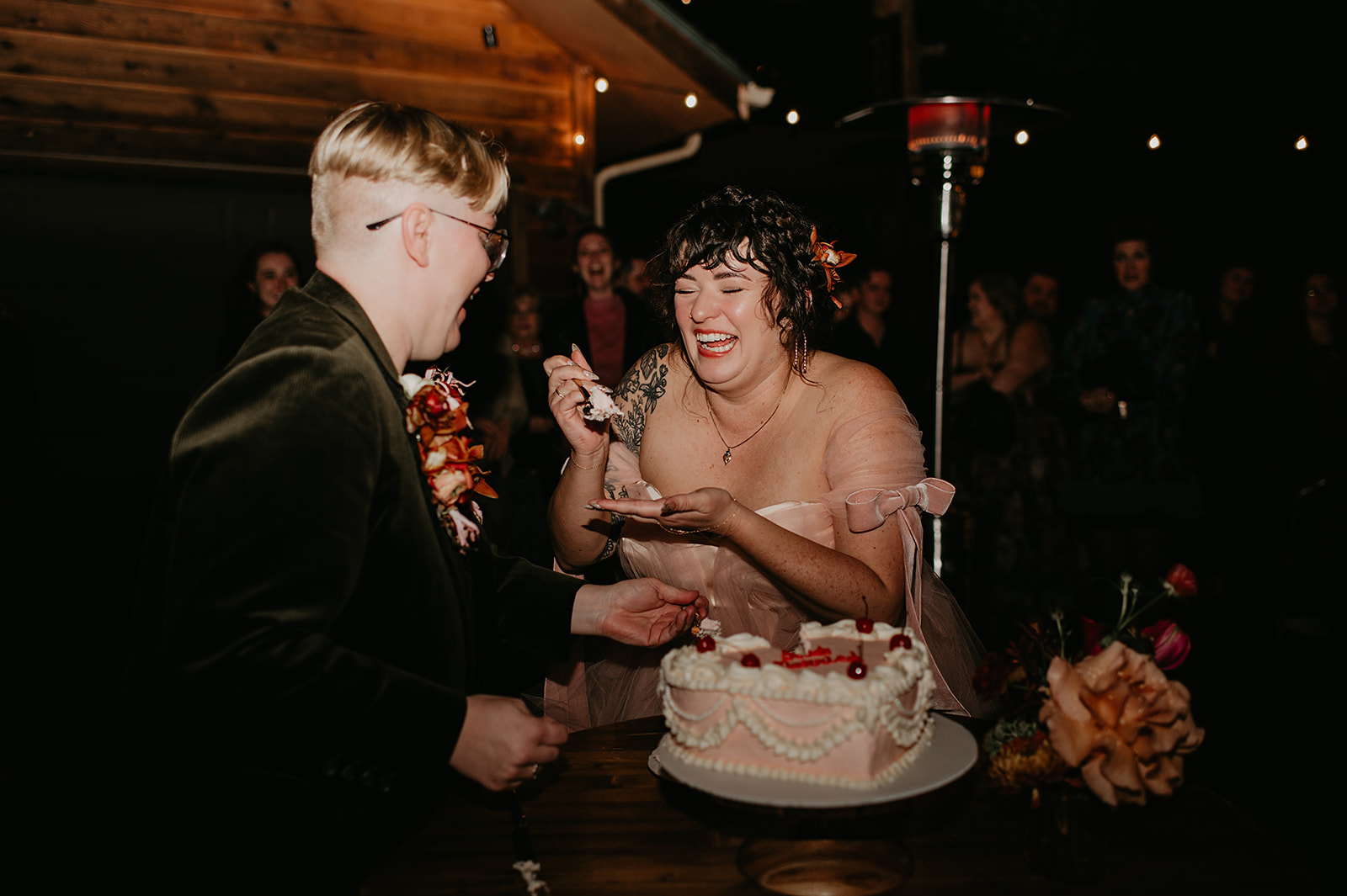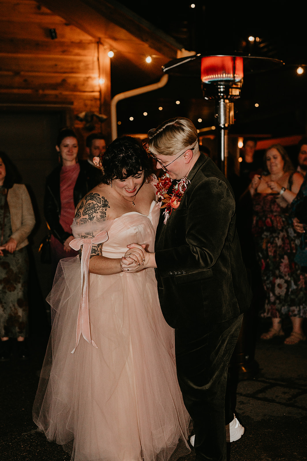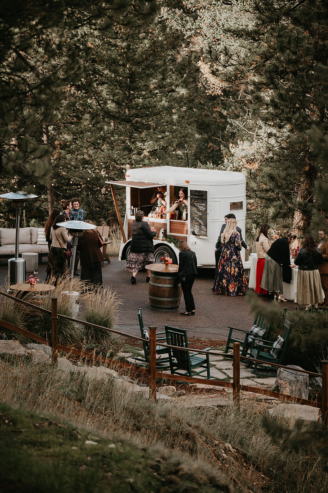 Dinner from Biscuits & Berries was served family-style on the Mountain View Deck, followed by toasts, cake from Snowstorm Sweets, and dancing under the stars. Guests enjoyed cookie skillets, the Chipper Booth photo booth, and the warm glow of light as music carried through the Evergreen night. The night ended with toasts and dancing beneath the stars — the perfect close to an Evergreen Colorado fall wedding weekend.