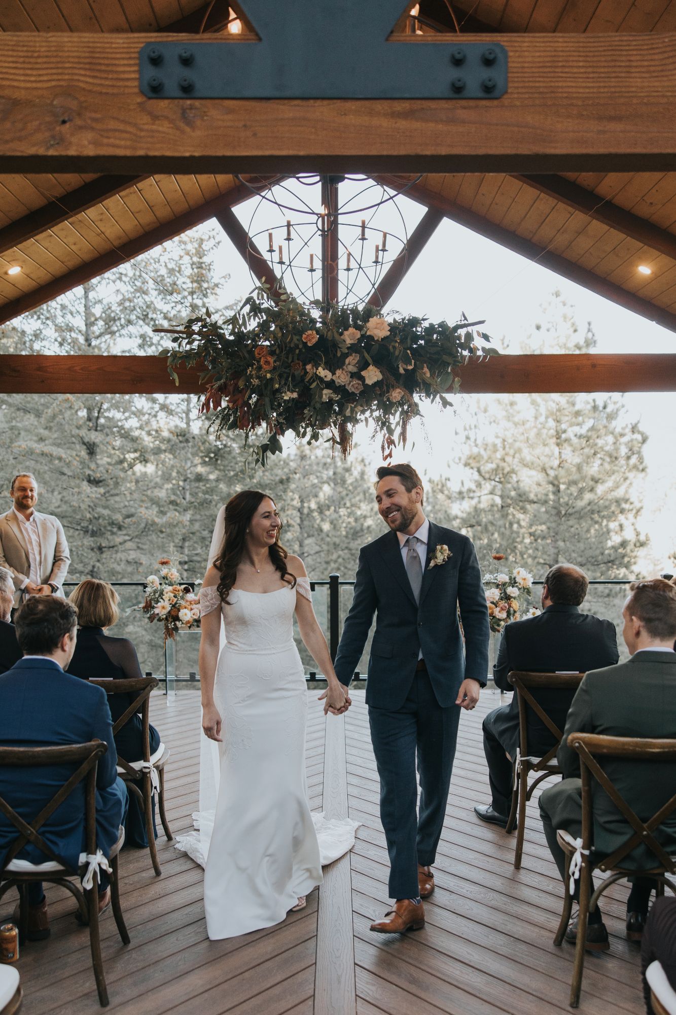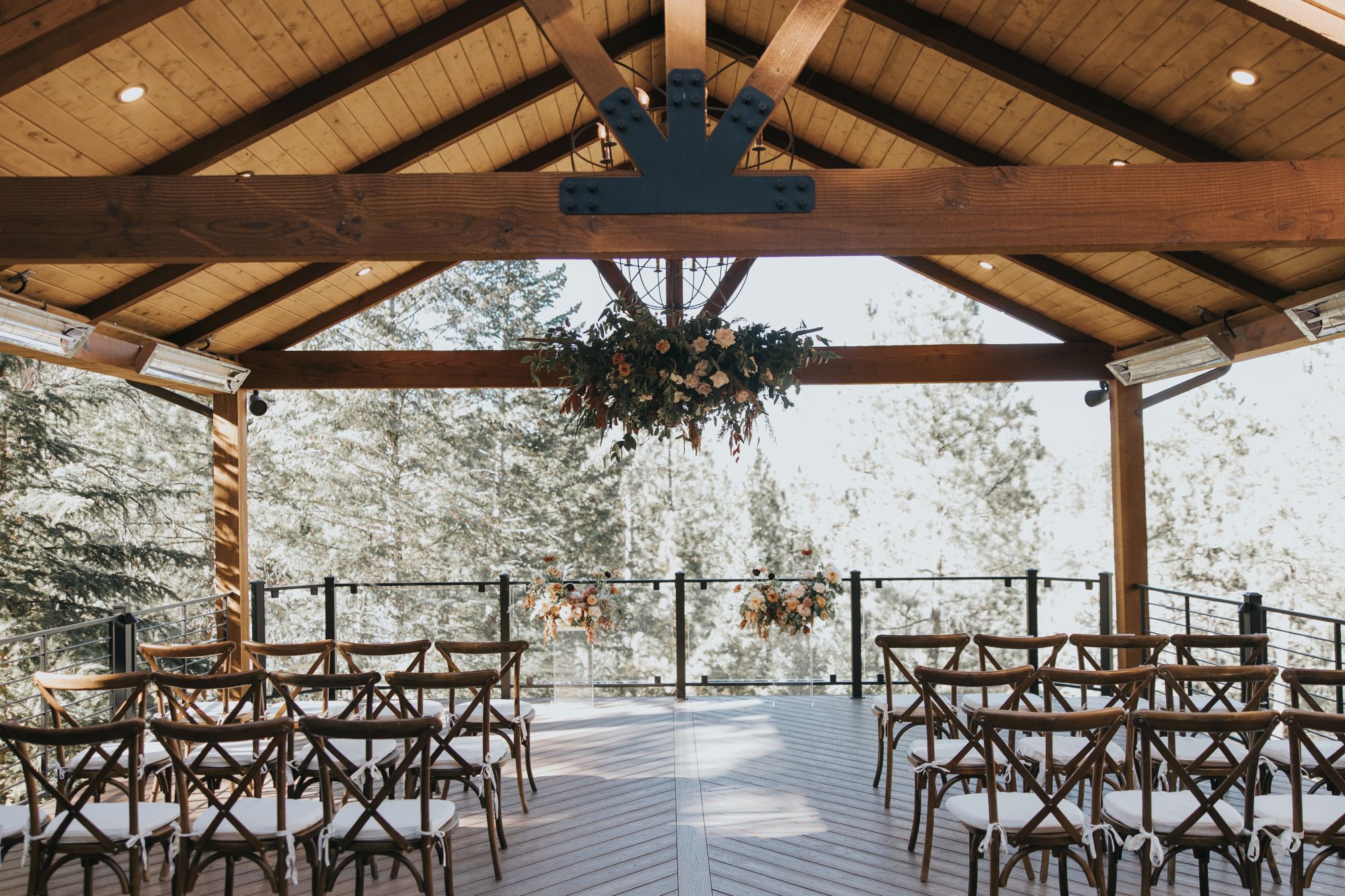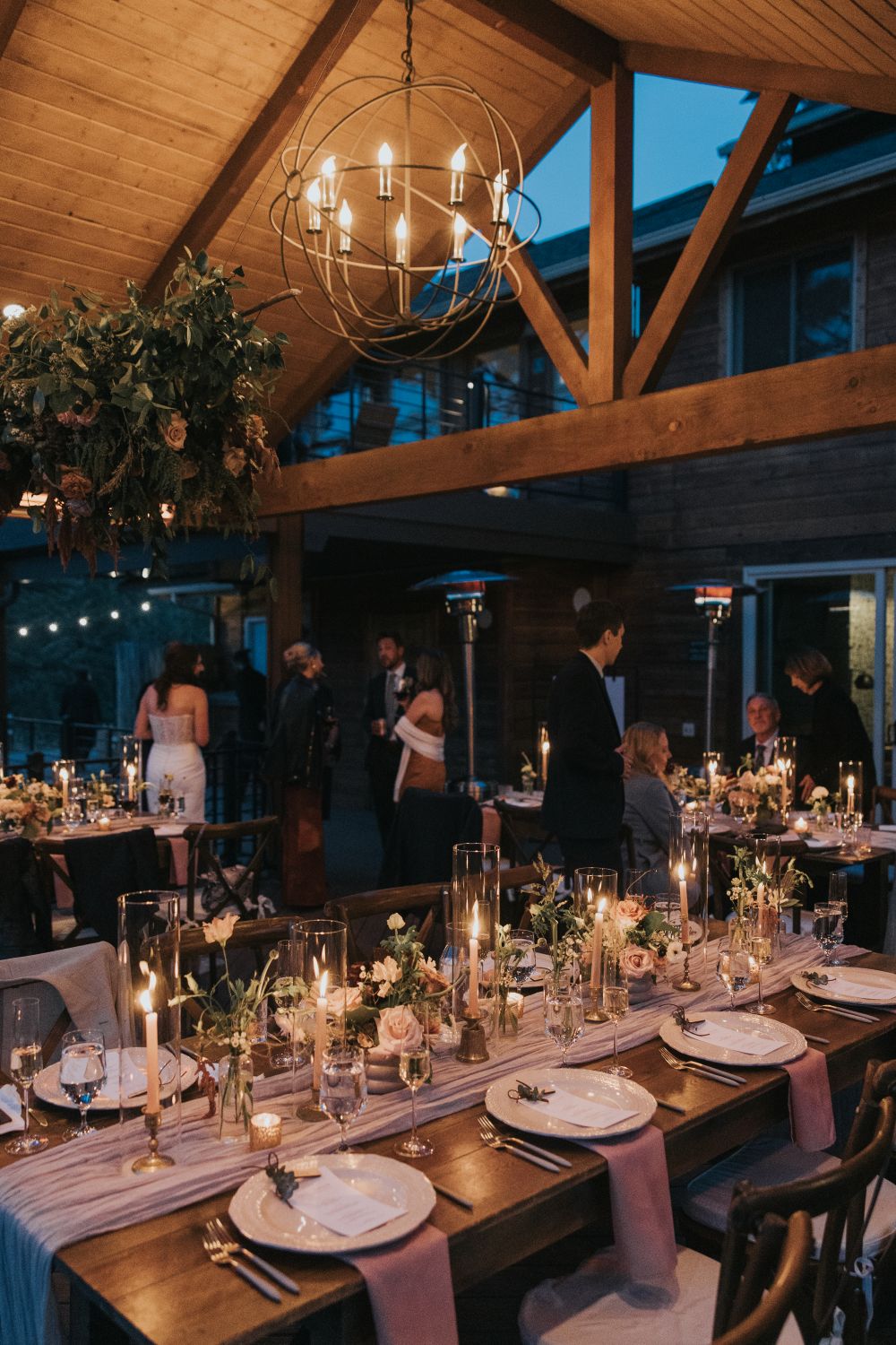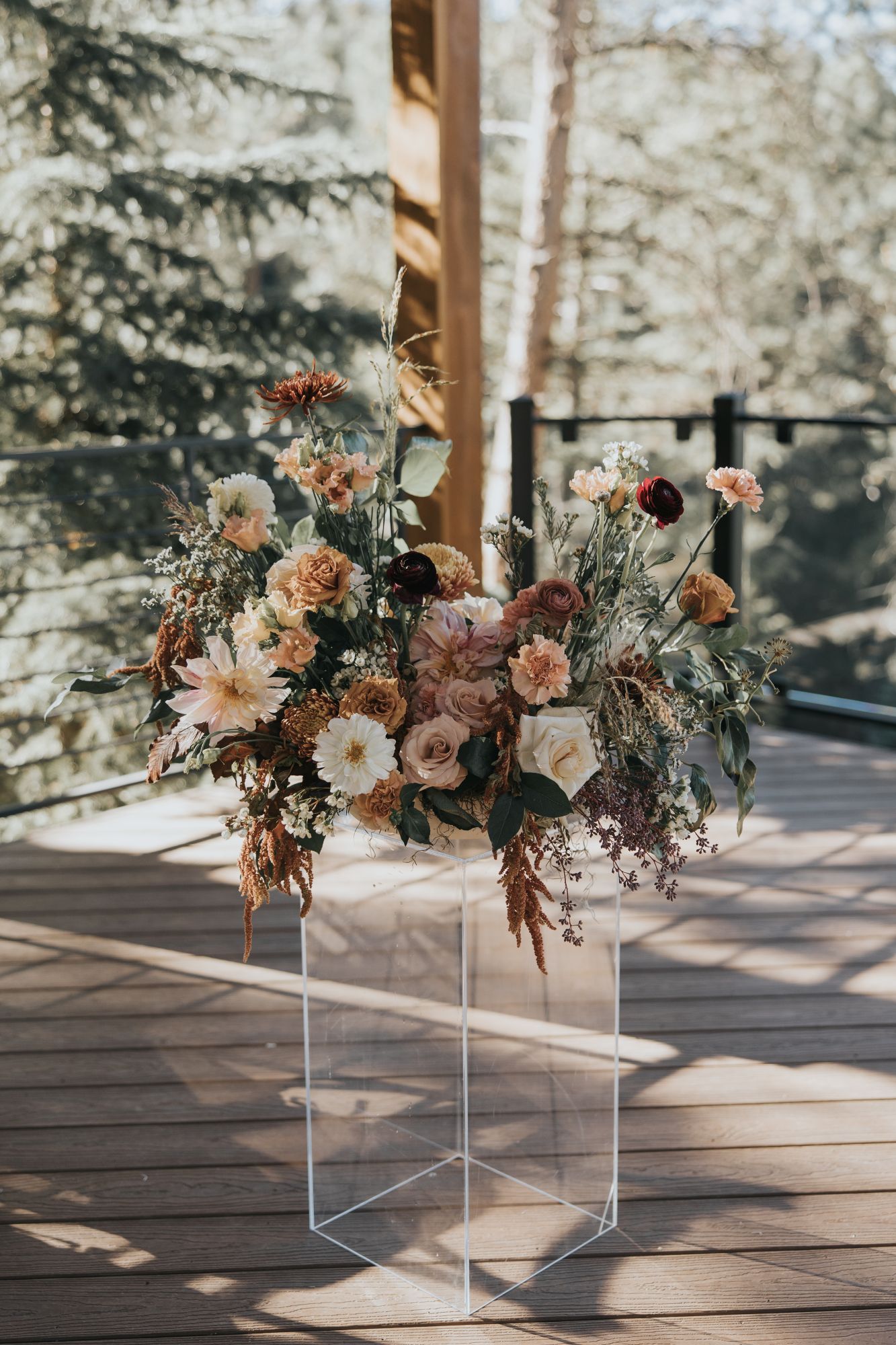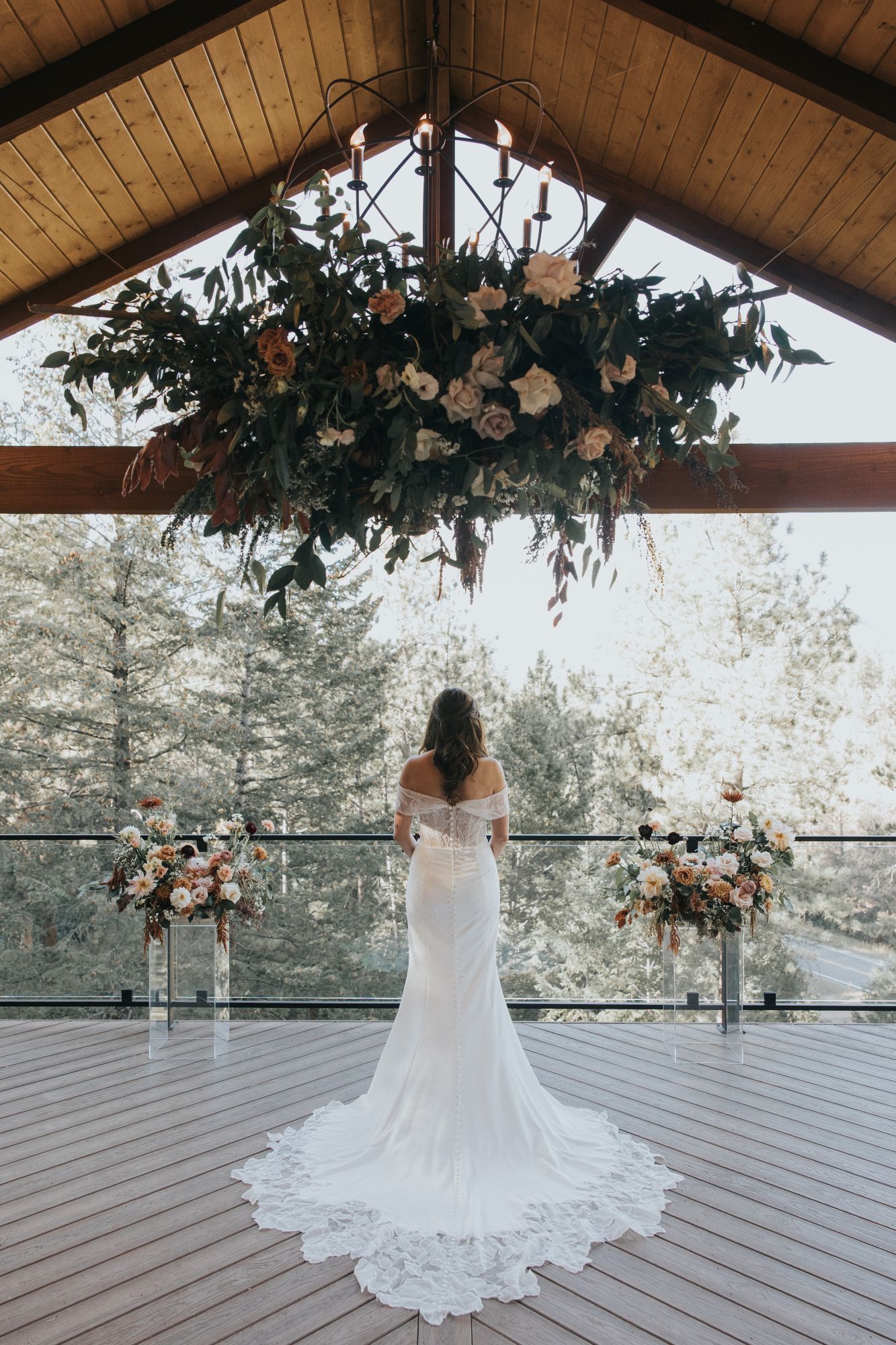 At 4:30 pm, guests gathered on the Mountain View Deck for a small, emotional ceremony. Snowberry Floral Co created floral pillars and a hanging installation that framed the view without taking away from it. With just 25 guests, the space felt calm, personal, and fully present.