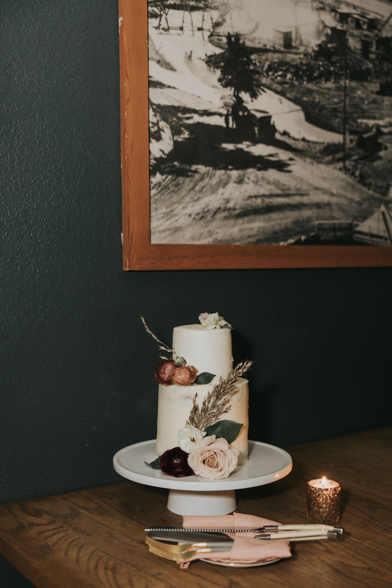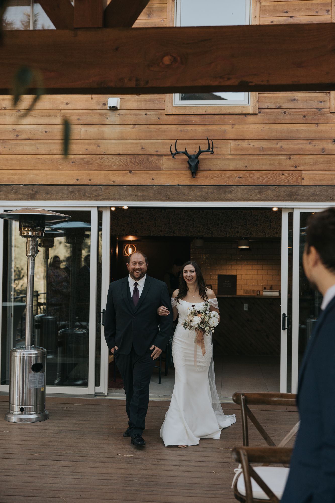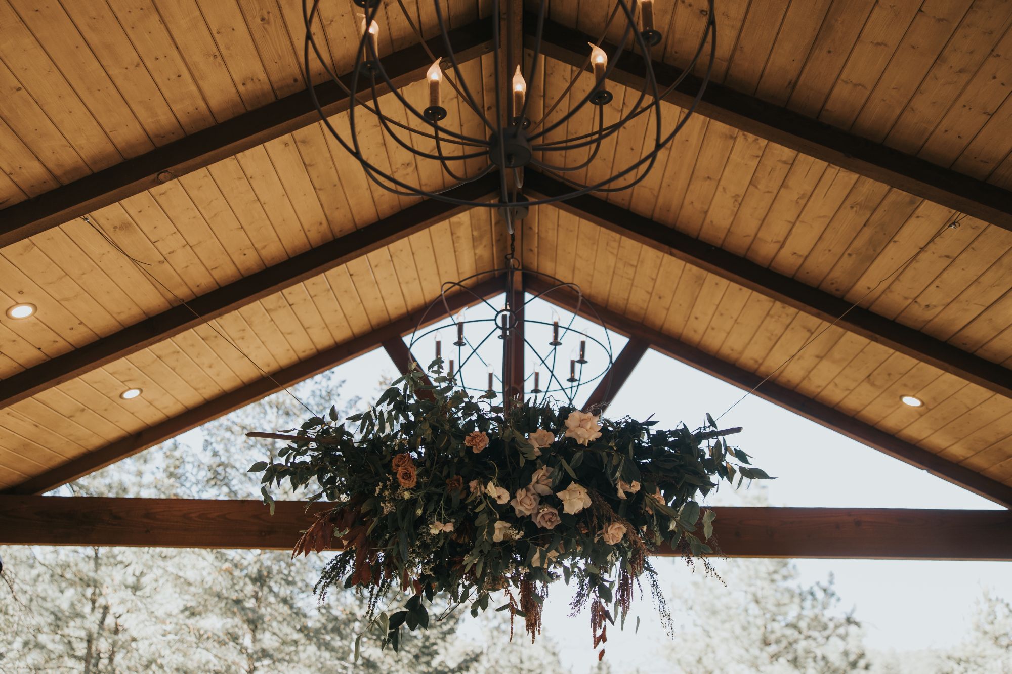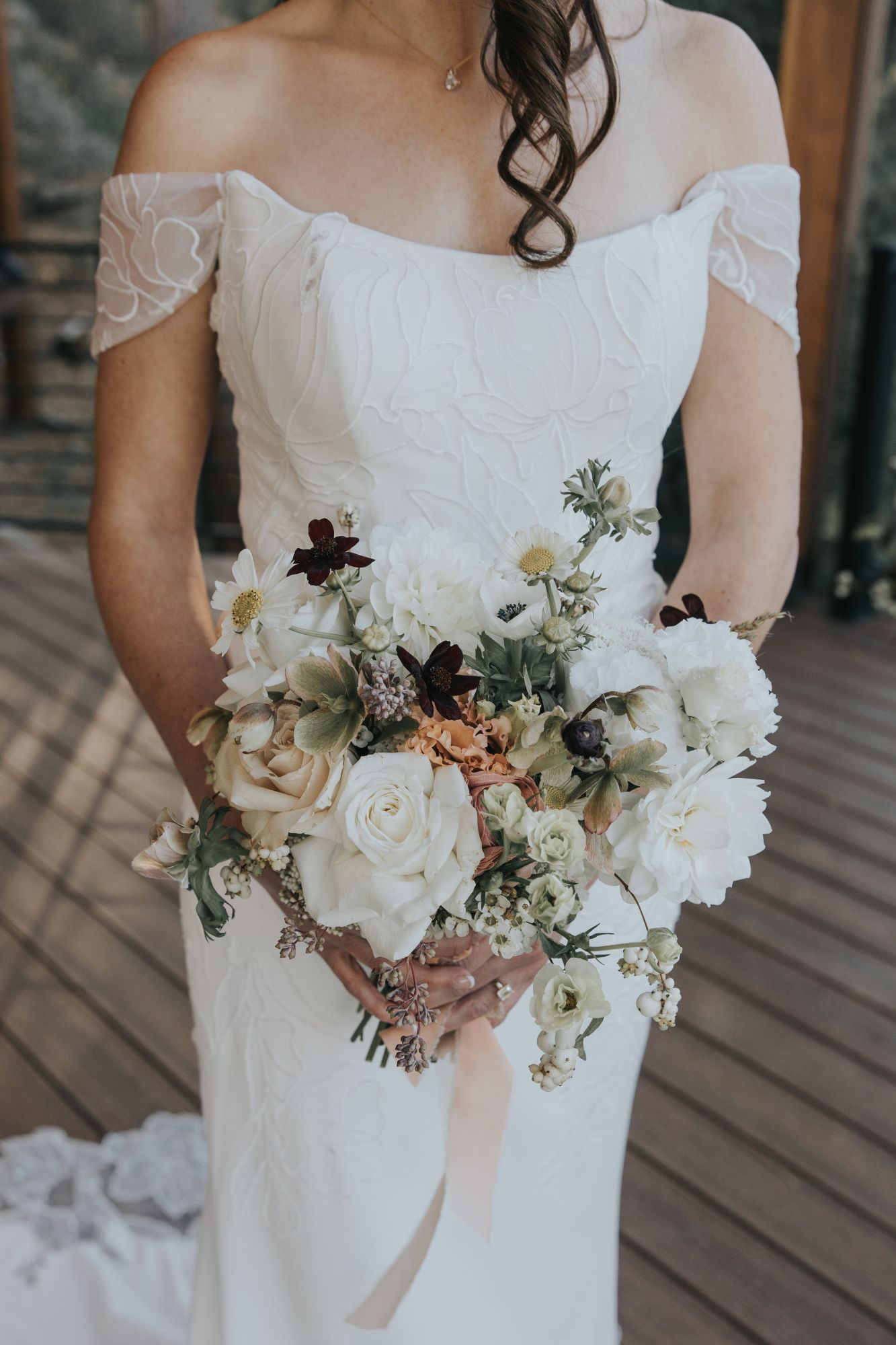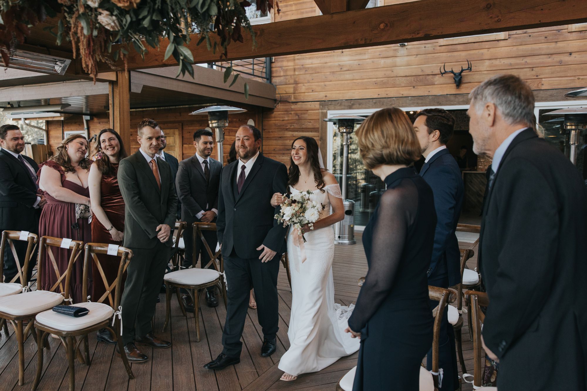 At 4:30 pm, guests gathered on the Mountain View Deck for a small, emotional ceremony. Snowberry Floral Co created floral pillars and a hanging installation that framed the view without taking away from it. With just 25 guests, the space felt calm, personal, and fully present.