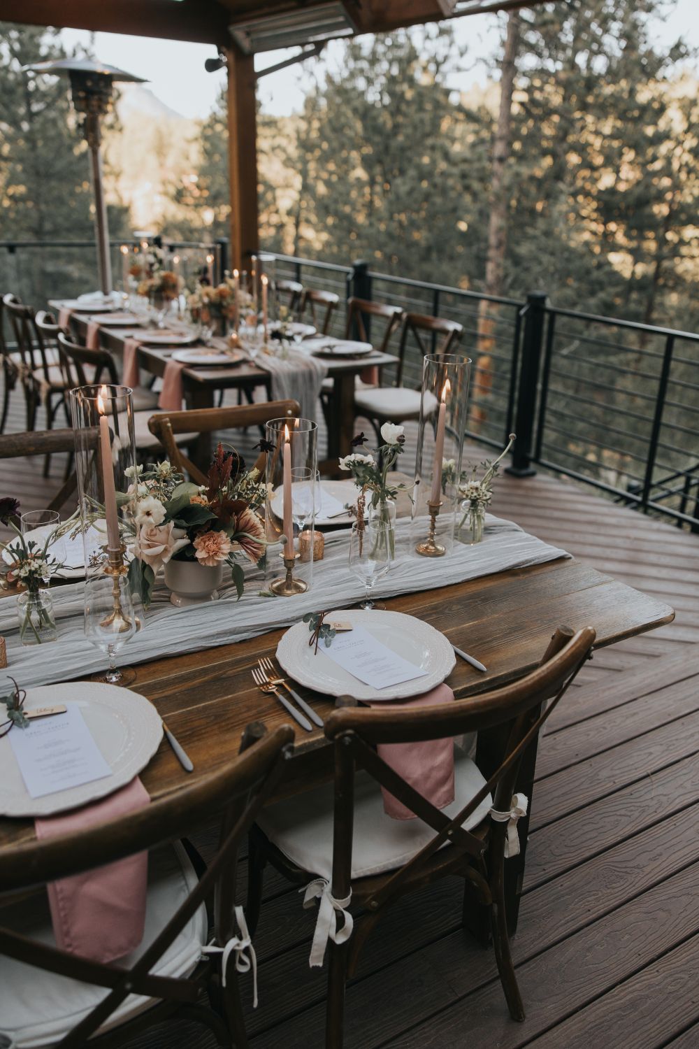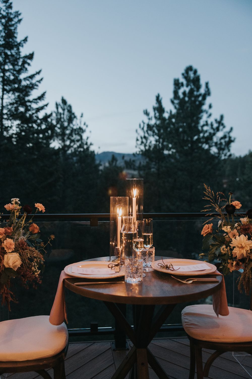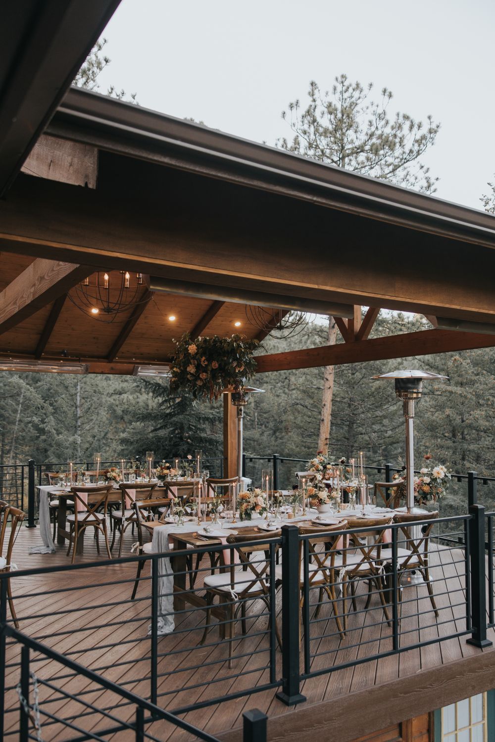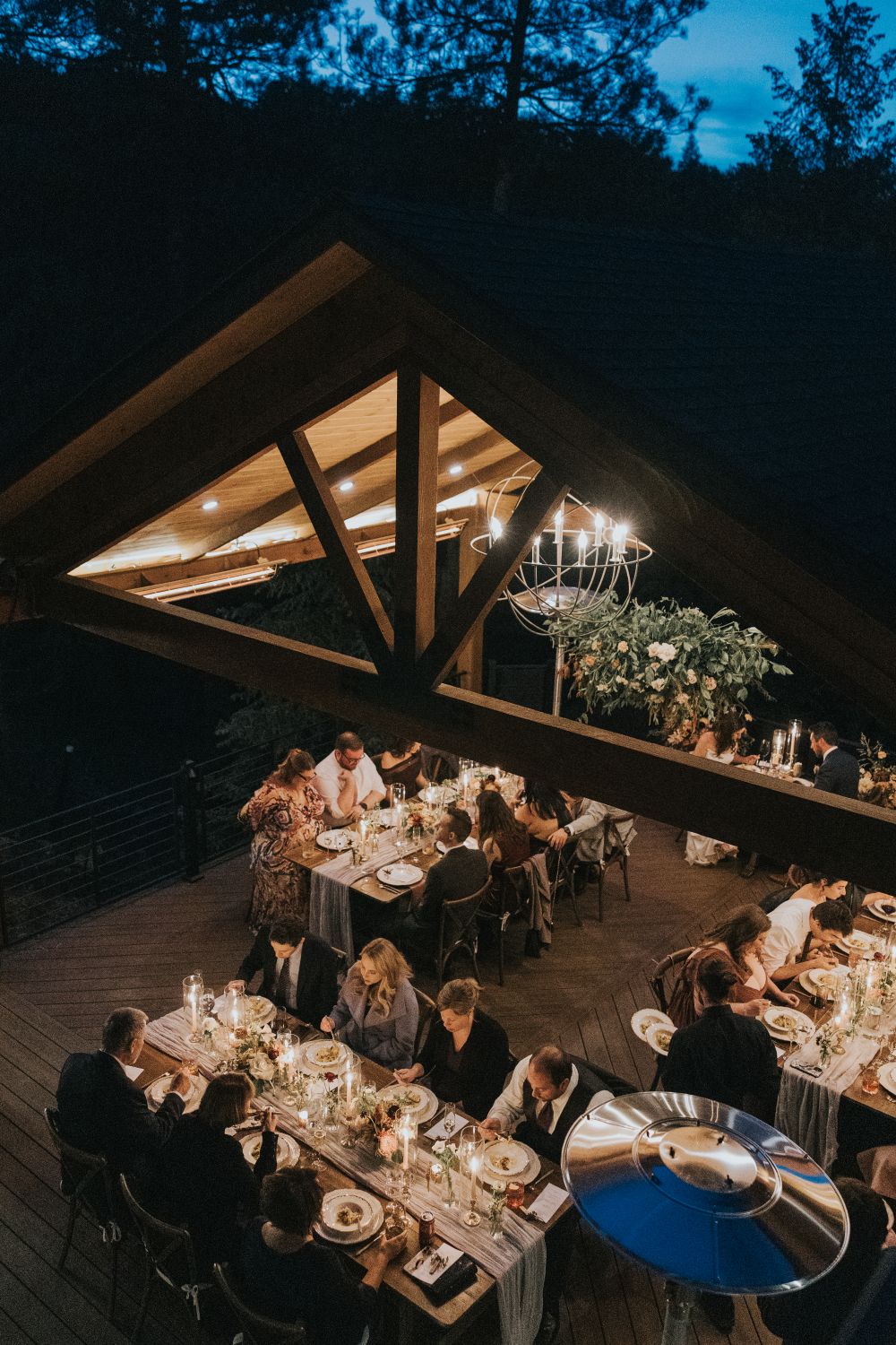 Dinner began just after sunset. Champagne was poured, Greg welcomed everyone, and the night eased into a warm, candlelit meal. Heaters from Premier Denver Event Rentals kept the deck comfortable, and the fall-inspired reception design from Colorado Party Rentals created a cozy, intimate atmosphere for conversation.