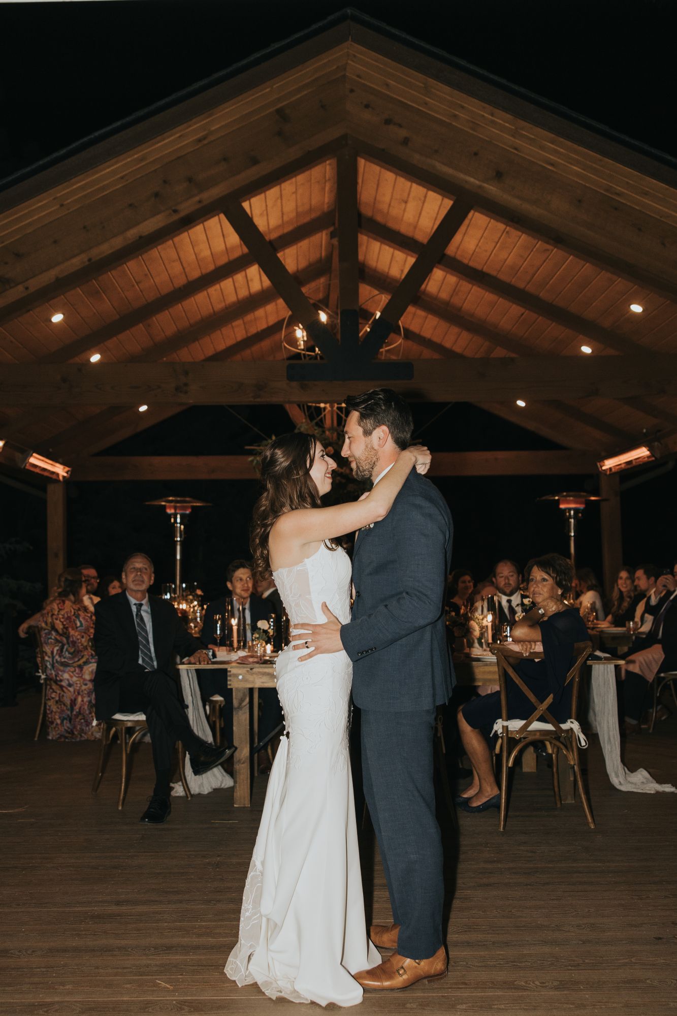 Once dinner wrapped, Taelor and Greg shared their first dance under the stars. The rest of the night moved into dancing, laughter, and an easy sense of togetherness. Shuttles carried off-site guests back through the foothills while a few people lingered inside the lodge. As cleanup finished, the property settled into a quiet fall night—exactly the kind of ending that fits a micro wedding in Evergreen, Colorado.