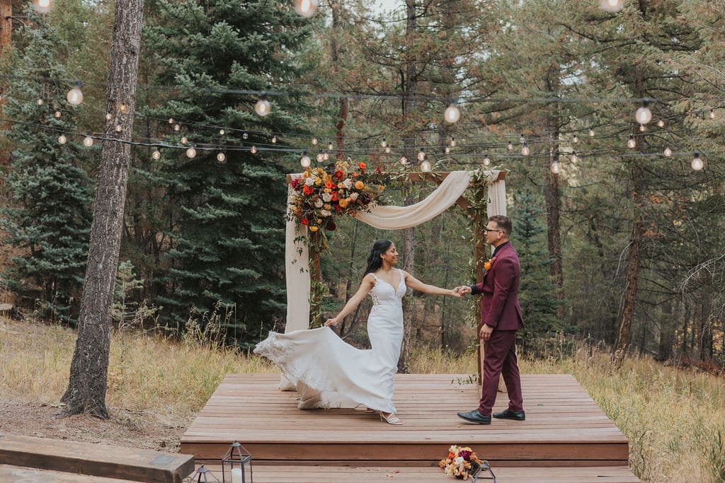 • Wedding ceremony under wooden arch with Snowberry Floral arrangements at Juniper Lodge & Treehouses